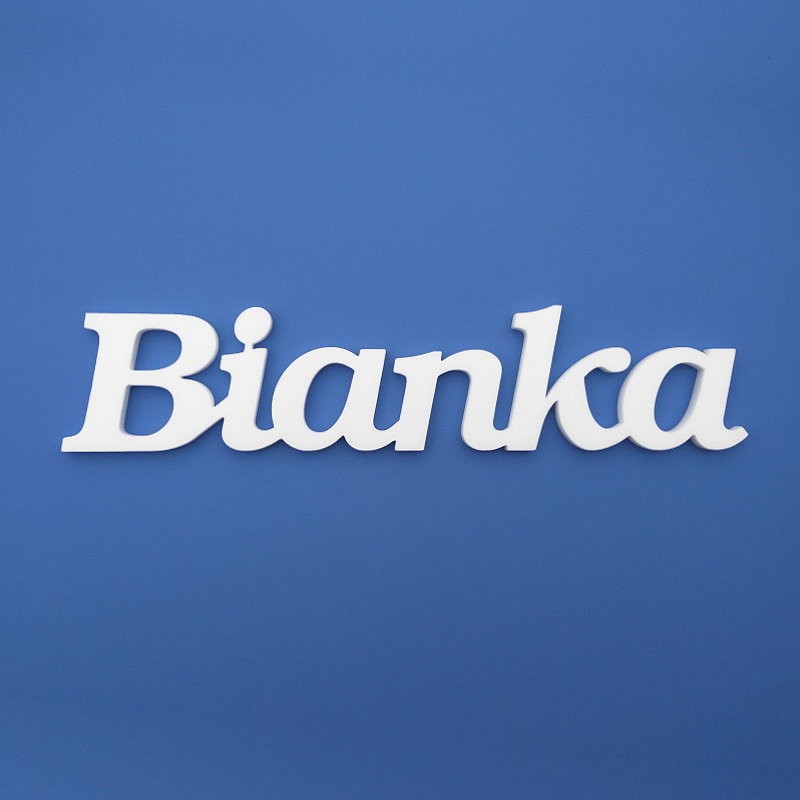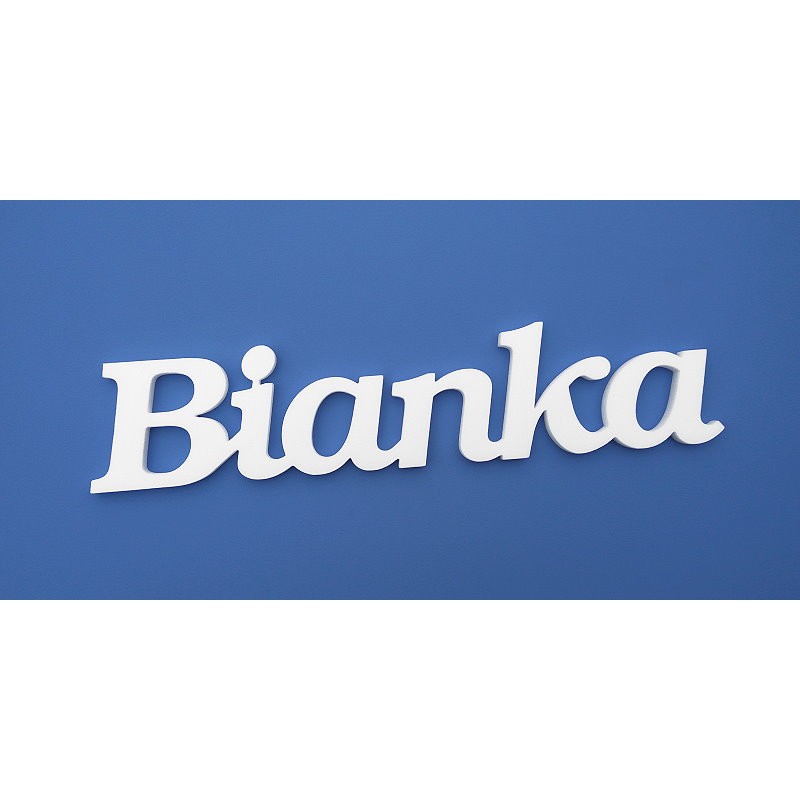 Ajtóra vagy gyerekszoba falára felragasztható, dekorációs célra készült Bianka név felirat, három féle választható magassággal, 0.9 cm vastagságú fehér színű Depron keményhab alapanyagból!